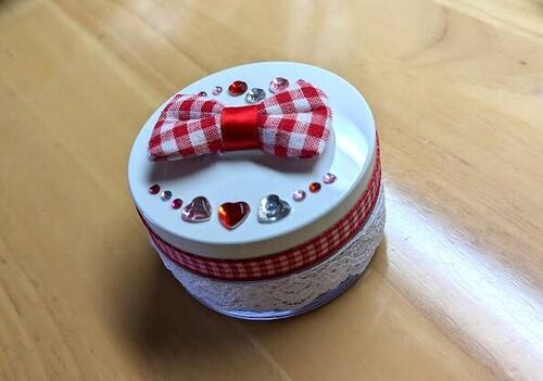 今日は気分転換に、ちょっとリメイクを楽しみました。 使い切ったフェイスパウダーのケース、何かに使えそう……。 リボンとかつけて可愛くしたら、娘用の小物入れが出来るんじゃ?? ということで、リボンとデコパーツをボンドと粘着テープでくっつけて完成☆ …